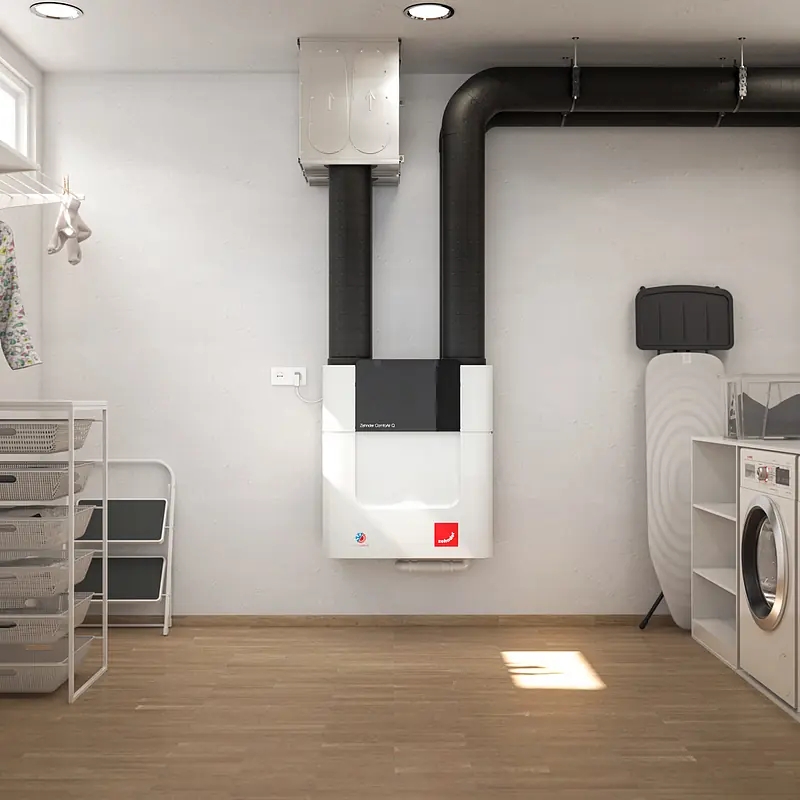 Uno de los principales aportes de Indujuval a este proyecto es el sistema Zehnder, una solución de ventilación mecánica con recuperación de calor (VMC-RC), diseñado para asegurar un flujo constante de aire fresco, filtrado y temperado. Este sistema no solo mejora la calidad del aire interior, sino que optimiza el consumo energético al recuperar hasta un 90% del calor del aire extraído. En viviendas pasivas, este tipo de tecnología es esencial para garantizar confort térmico sin sacrificar eficiencia.