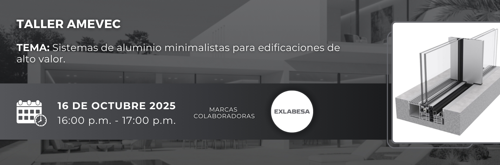 En esta ponencia, EXLABESA expondrá sus sistemas de aluminio de alto valor añadido y como éstos son capaces de resolver de forma eficaz las exigencias de la arquitectura y la edificación contemporánea respecto a diseños minimalistas, grandes aperturas, acabados de alta calidad o prestaciones térmicas, acústicas y de aislamiento premium.